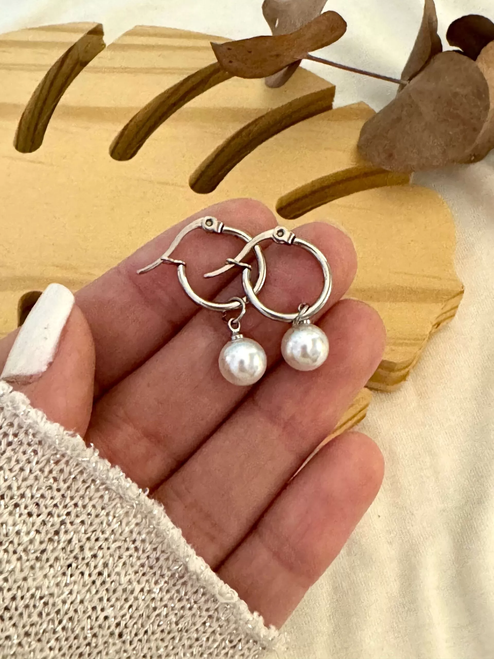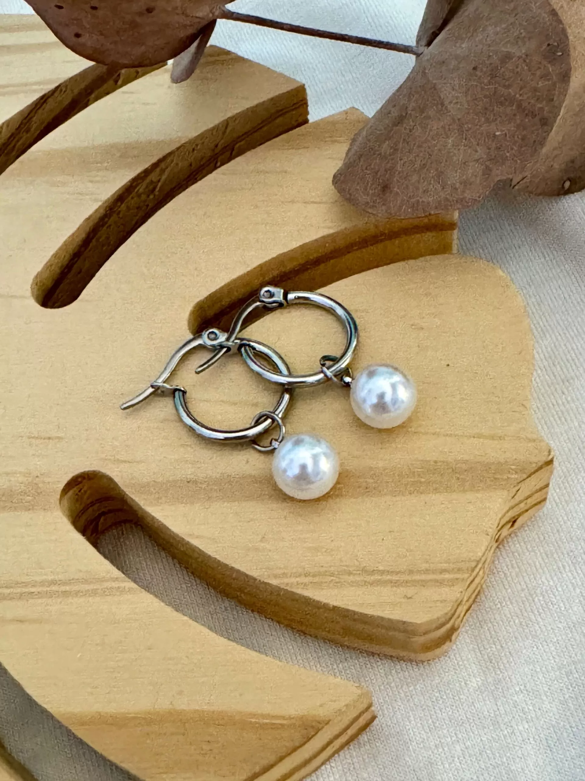 Argollitas de acero quirúrgico hipoalargénico con perlas colgantes.
