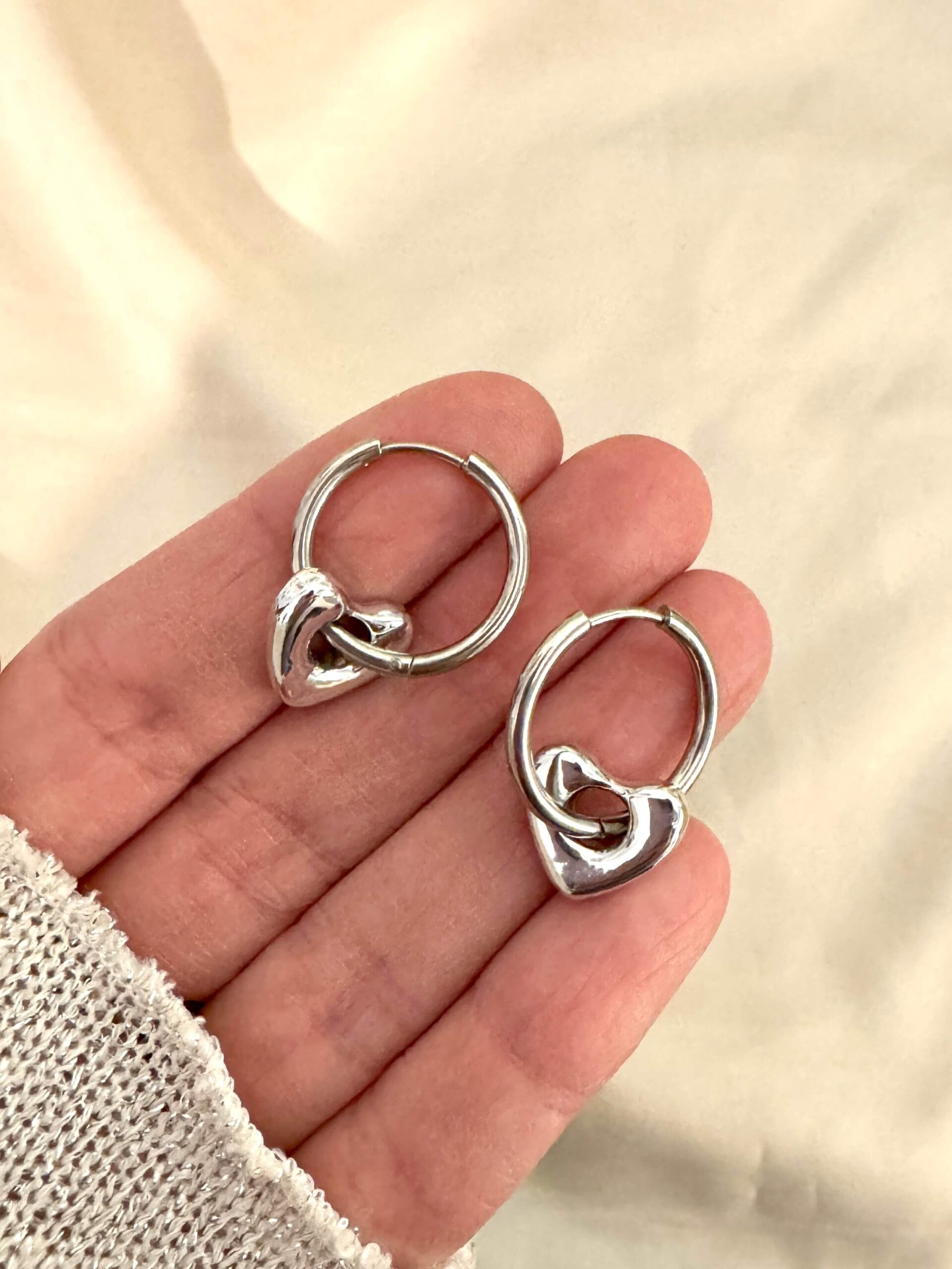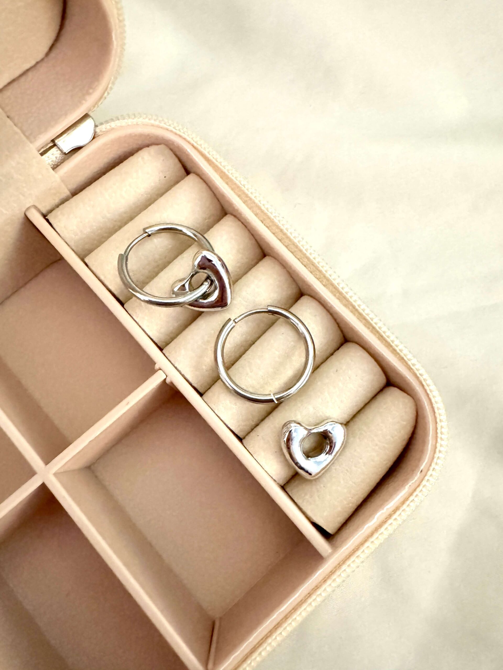 Argollas de acero quirúrgico hipoalargénico con cierre clic y dijes de corazón inflados y livianos los cuáles se pueden sacar para usar las argollas solitas con un estilo más clásico.