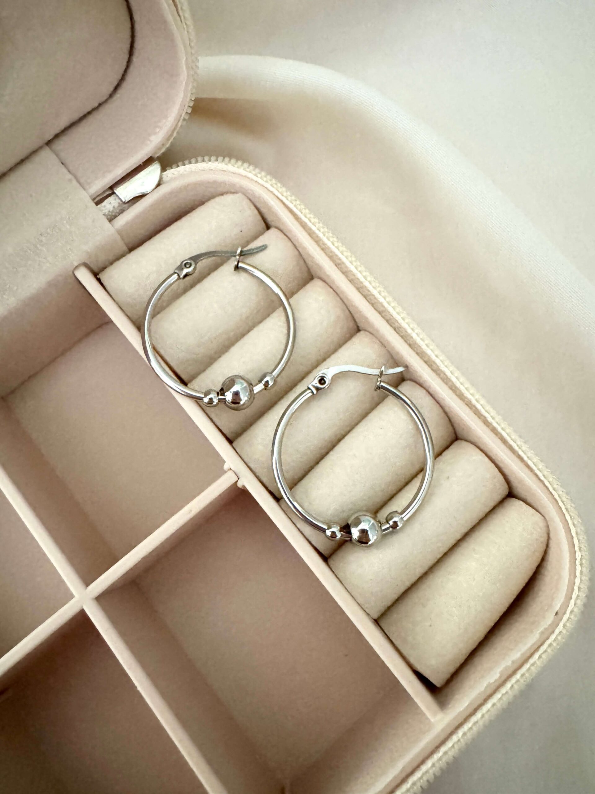 Argollas de acero quirúrgico hipoalargénico con tres bolitas.