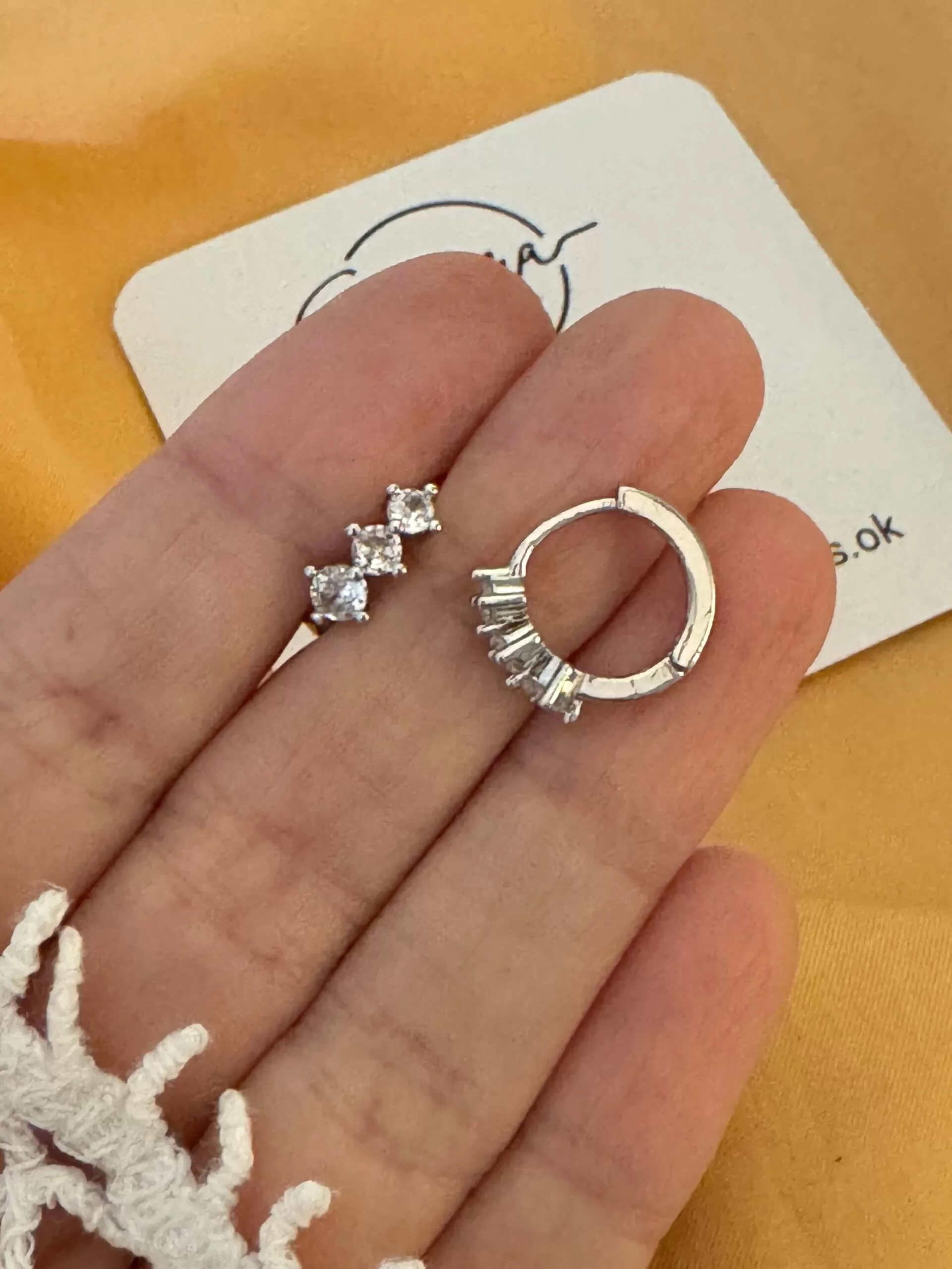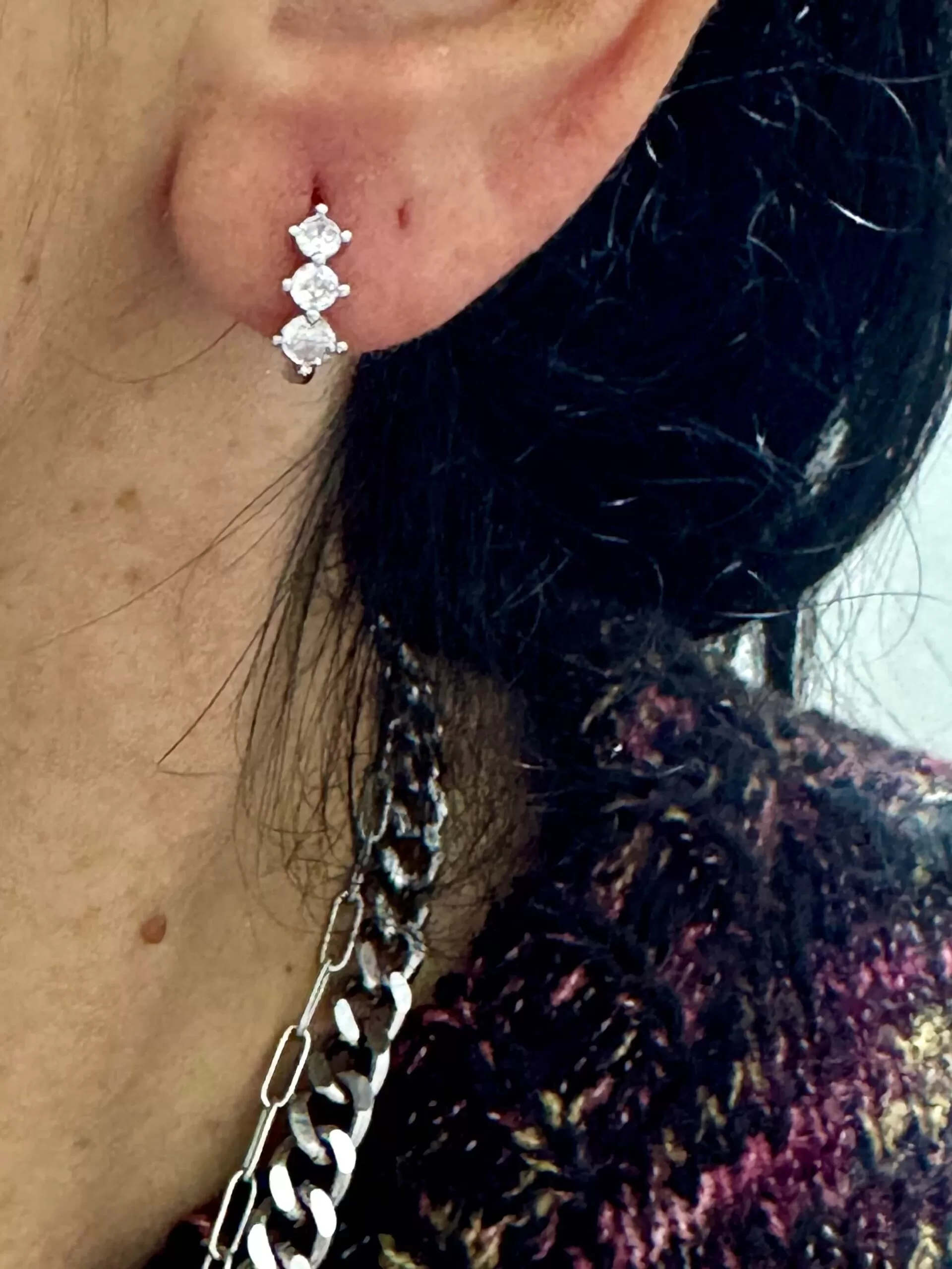 Argollas de niquel con tres cubic en forma de rombo. Su cierre es clic, súper fácil de abrir y cerrar.