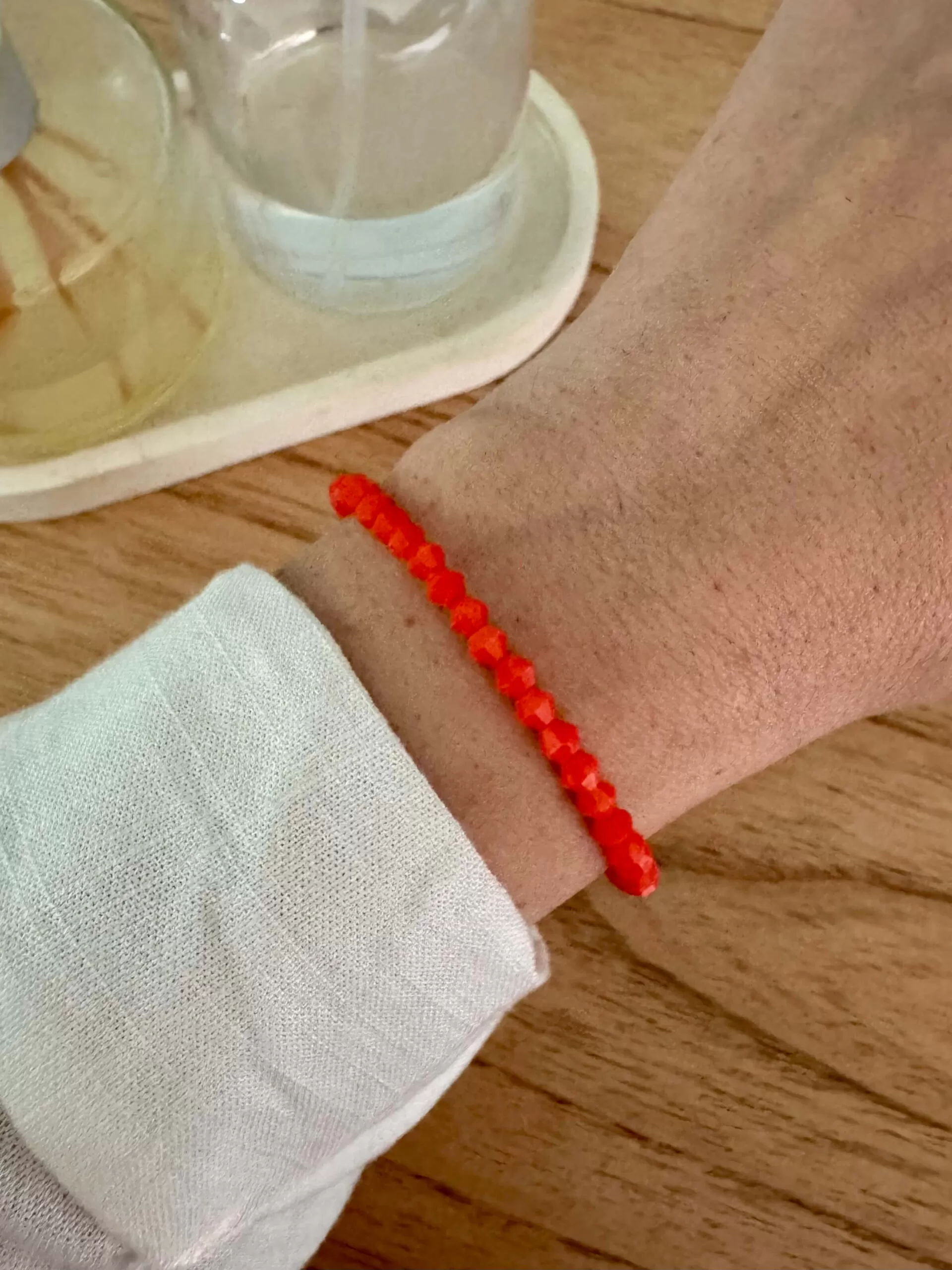 Pulsera hecha a mano con cristales rombo rojo anaranjado  y cierres de acero quirúrgico.