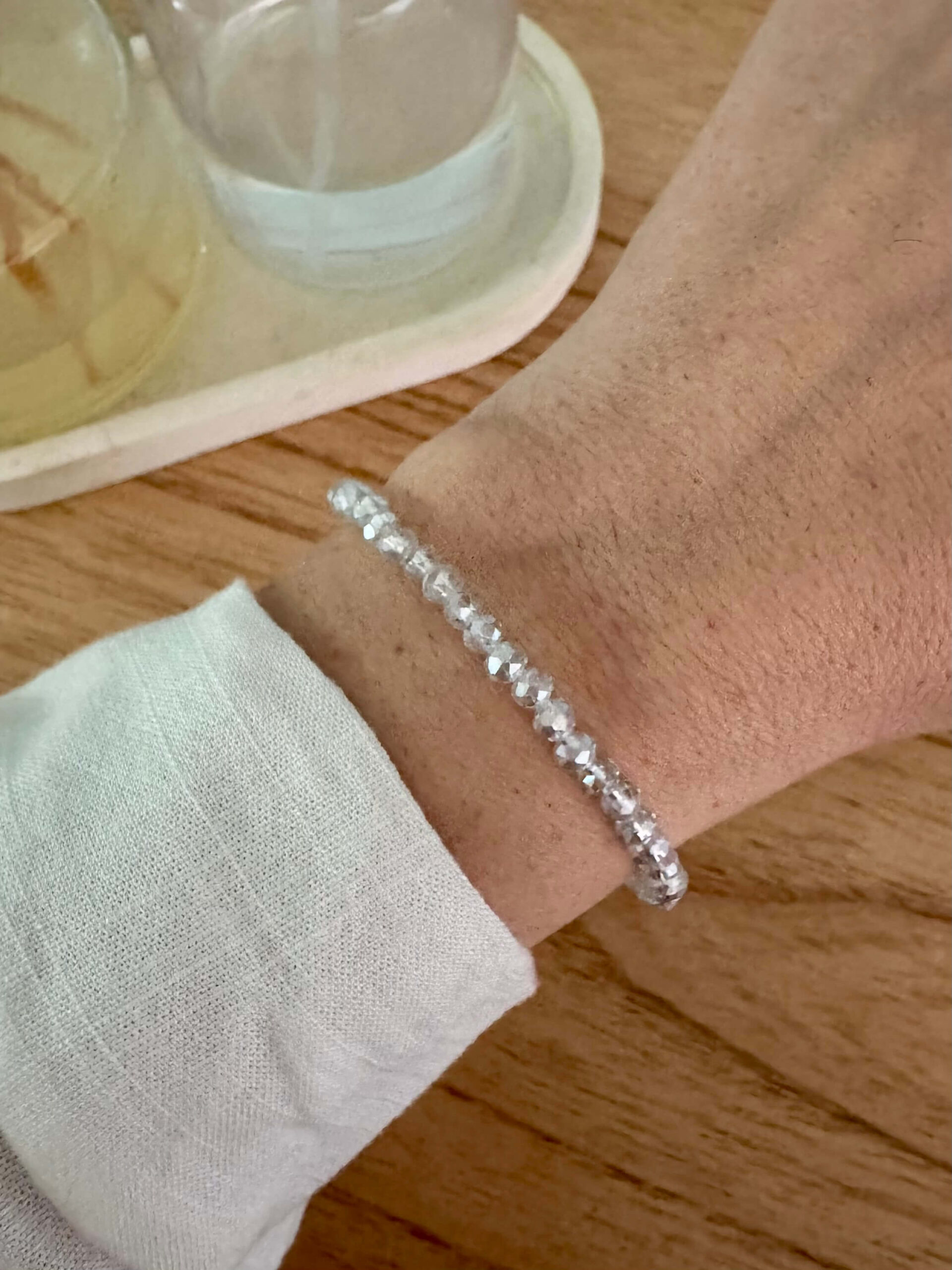 Pulsera hecha a mano con cristales de roca traslúcidos y cierres de acero quirúrgico.