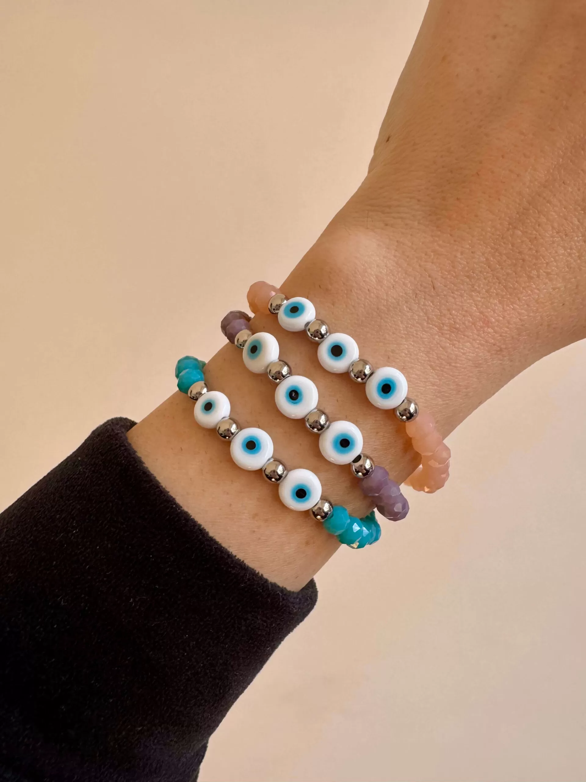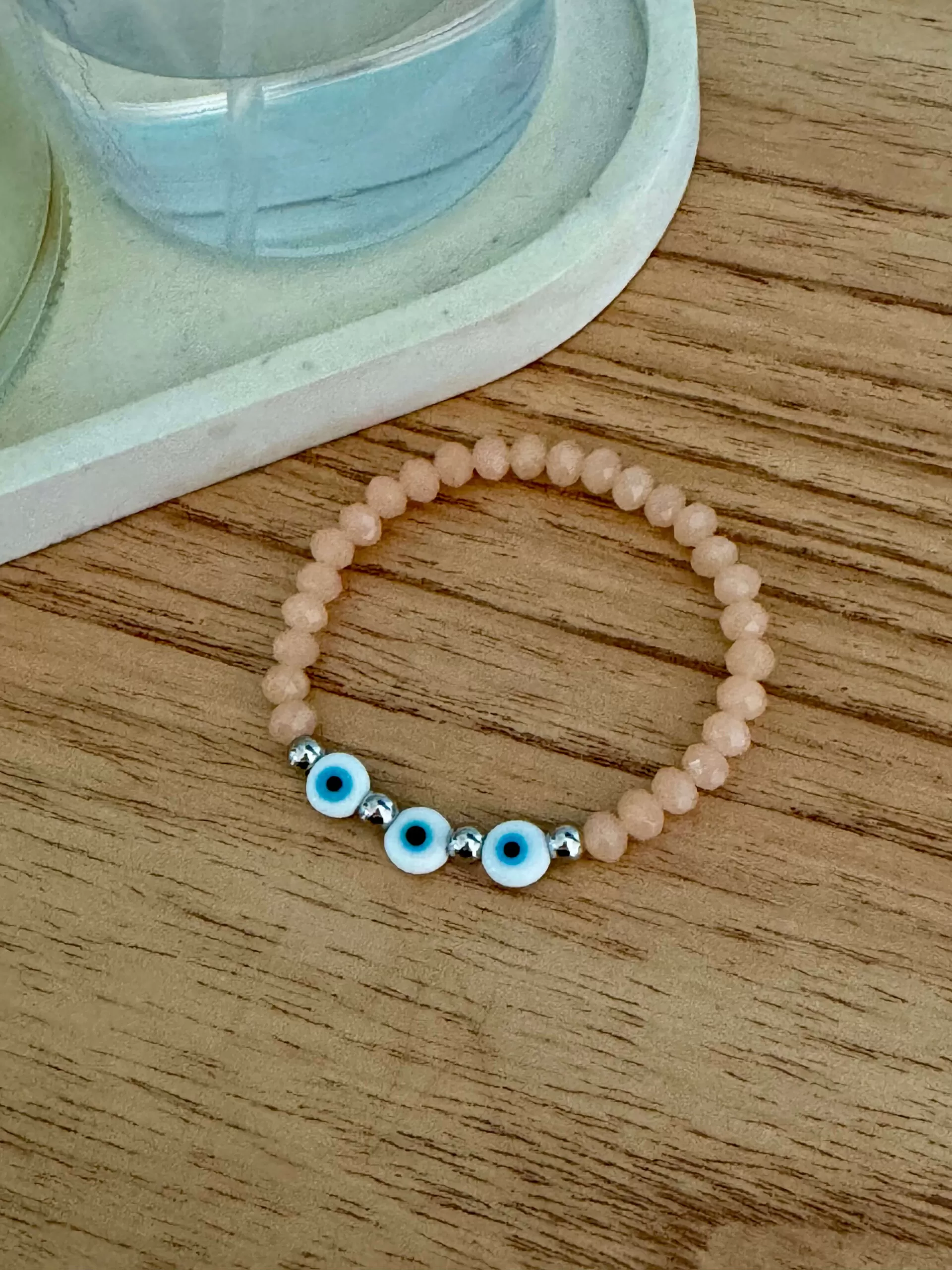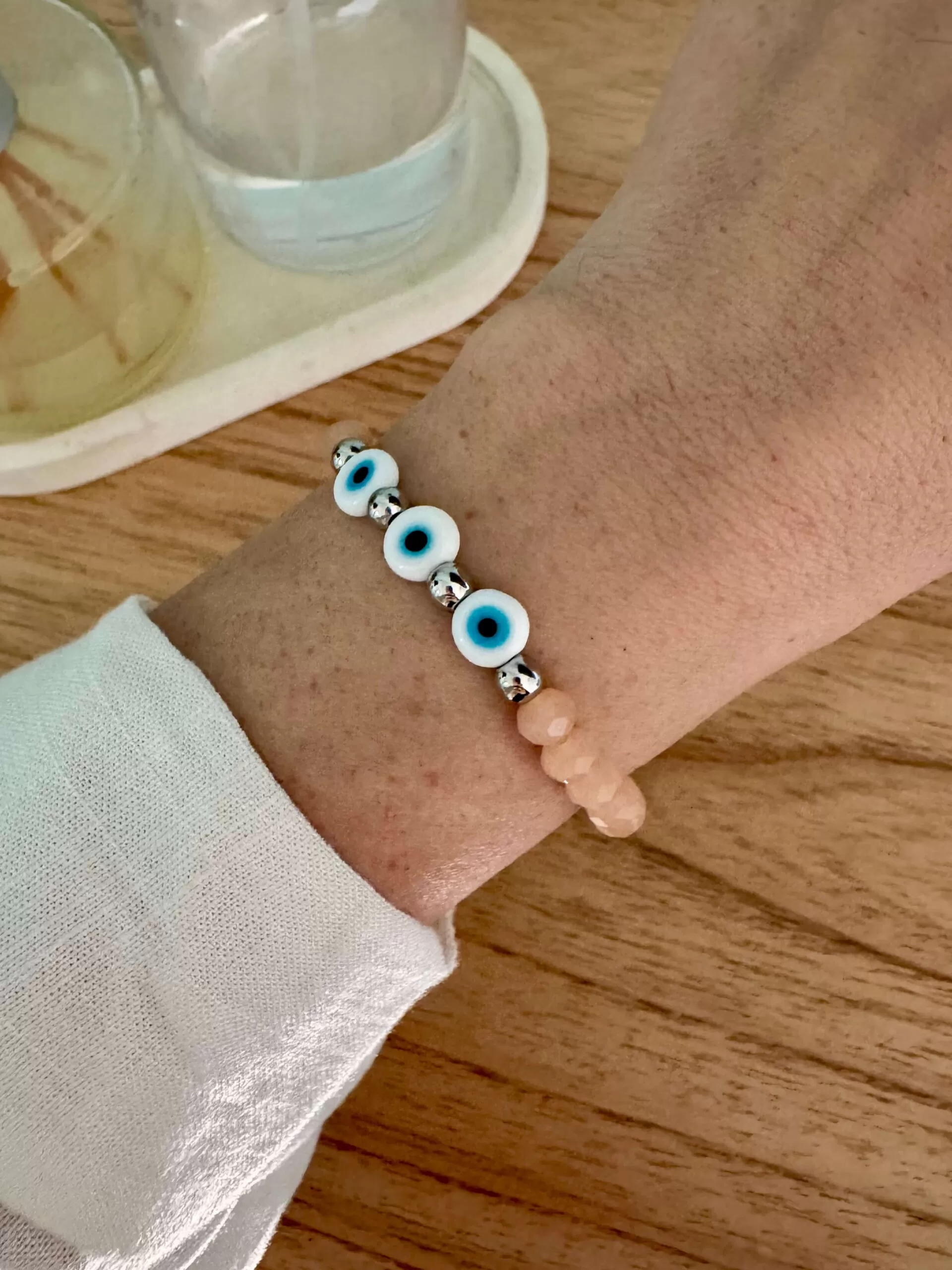 Pulsera elástica protectora hecha con cristales de roca color beige de 6 mm., bolitas de acero quirúrgico y ojos turcos de vidrio.