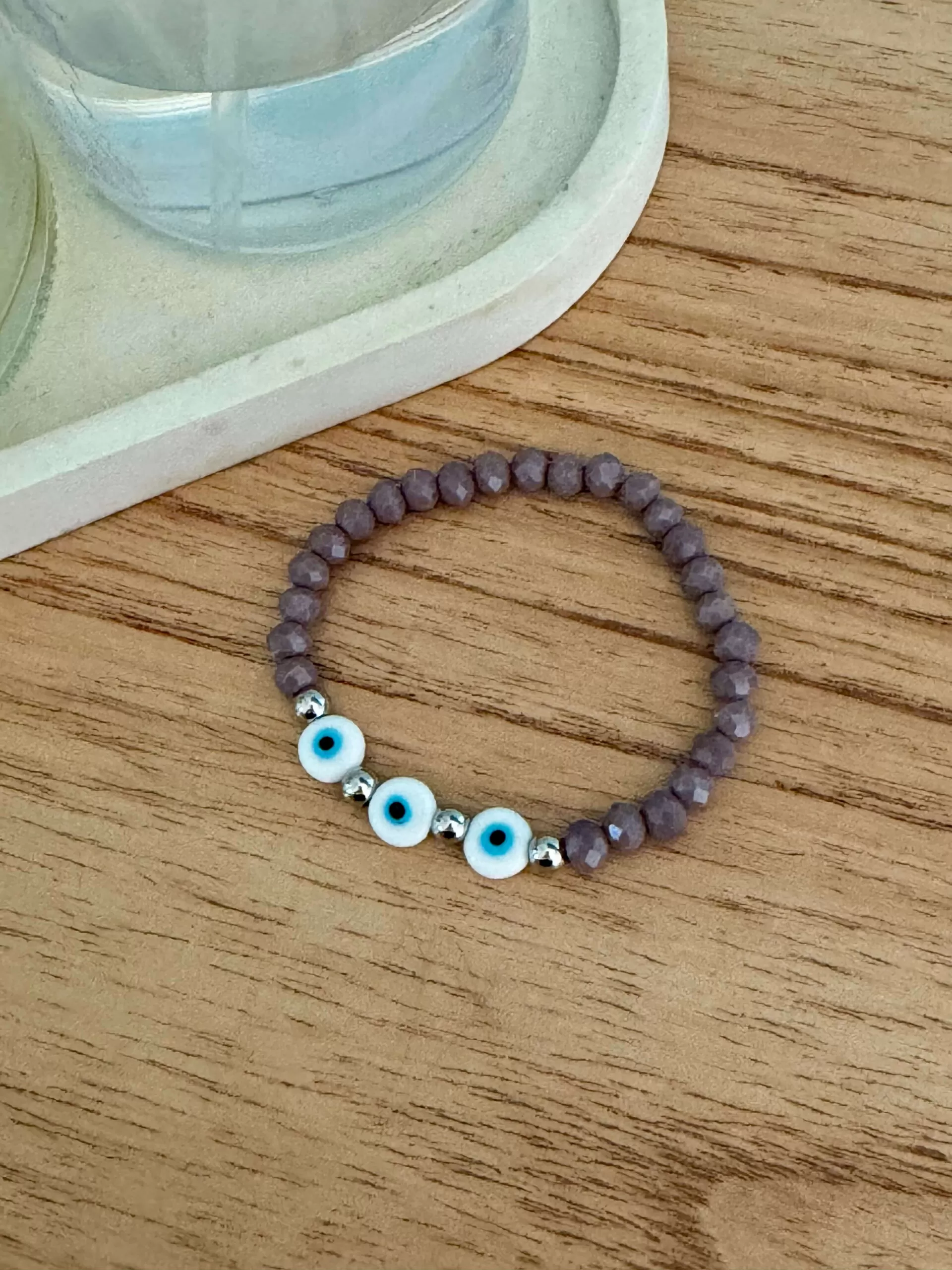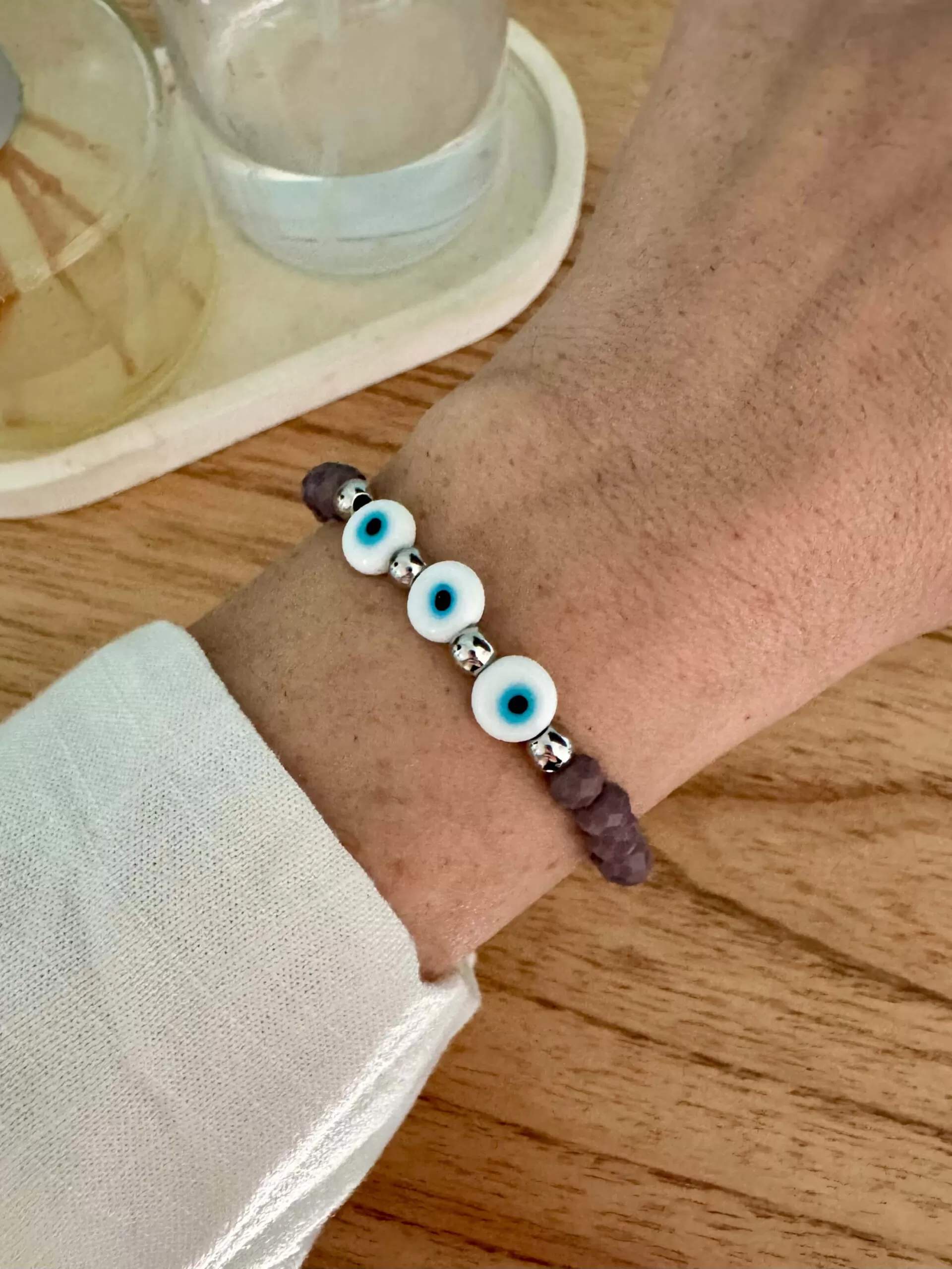 Pulsera elástica protectora hecha con cristales de roca color violeta viejo de 6 mm., bolitas de acero quirúrgico y ojos turcos de vidrio.