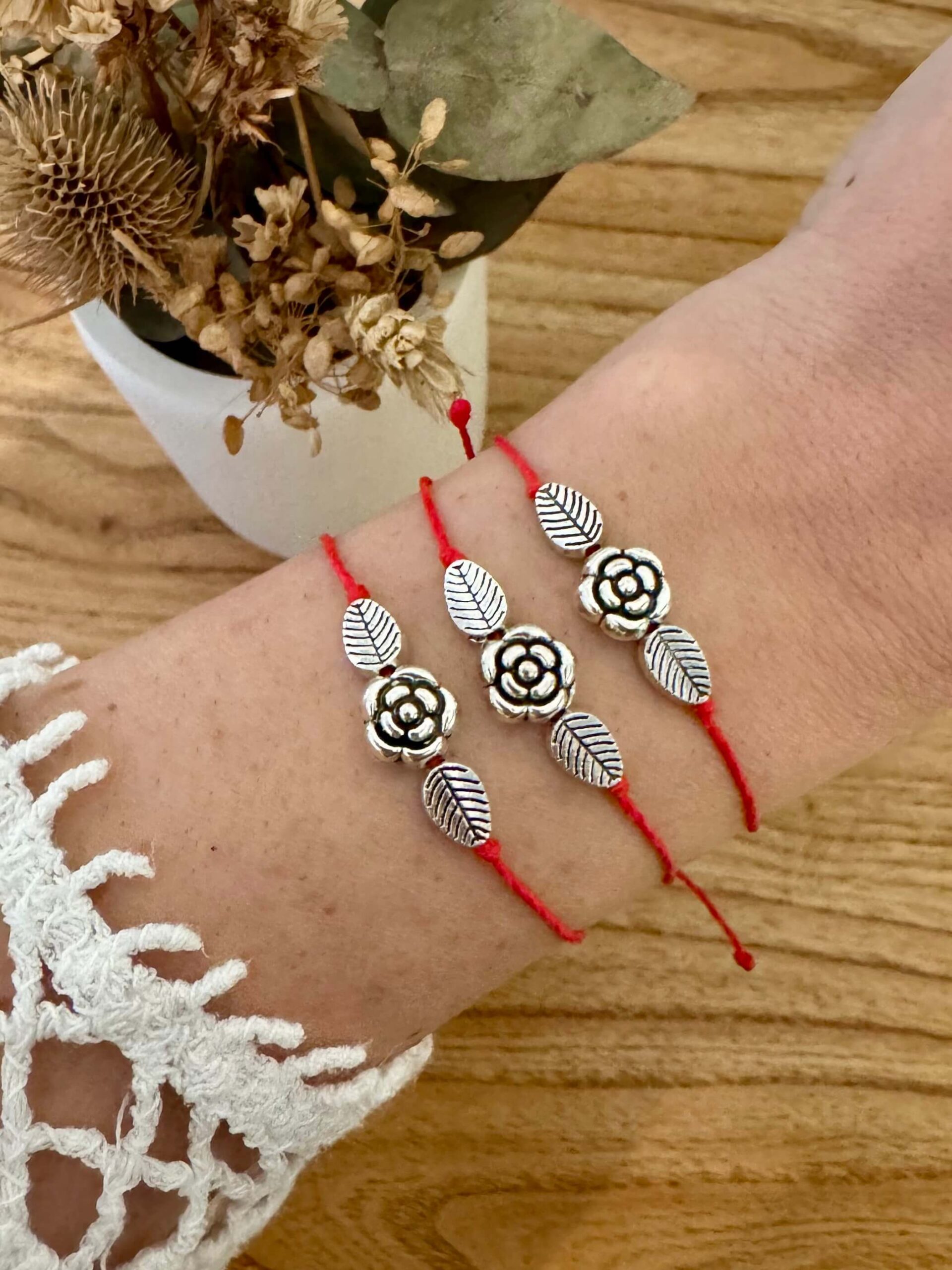 Pulsera de hilo rojo encerado con dijes pasantes flor y hojas de fundición.