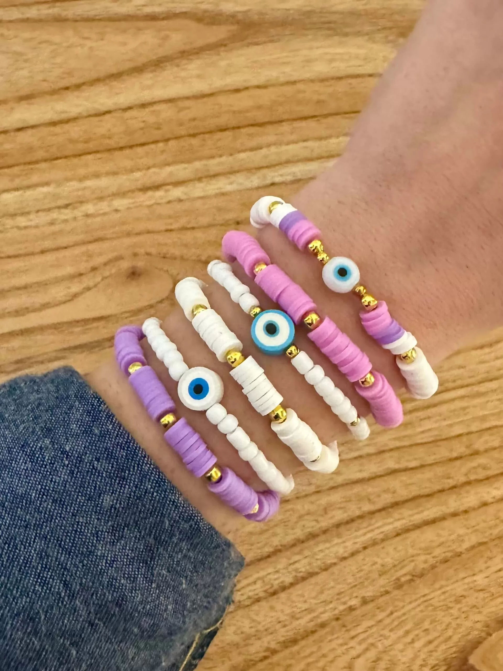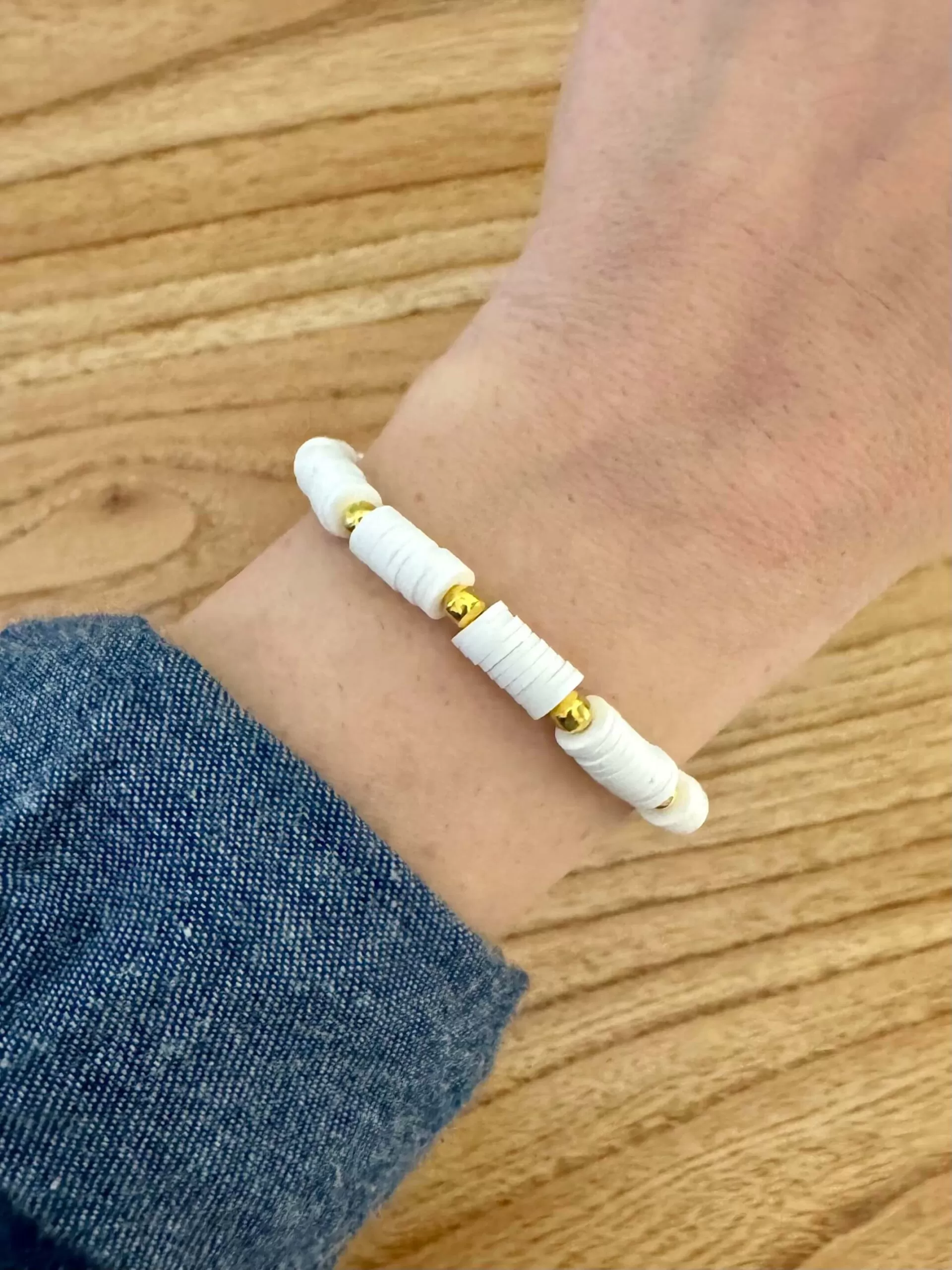 Pulsera elastizada con fimo blanco y bolitas de metal doradas.