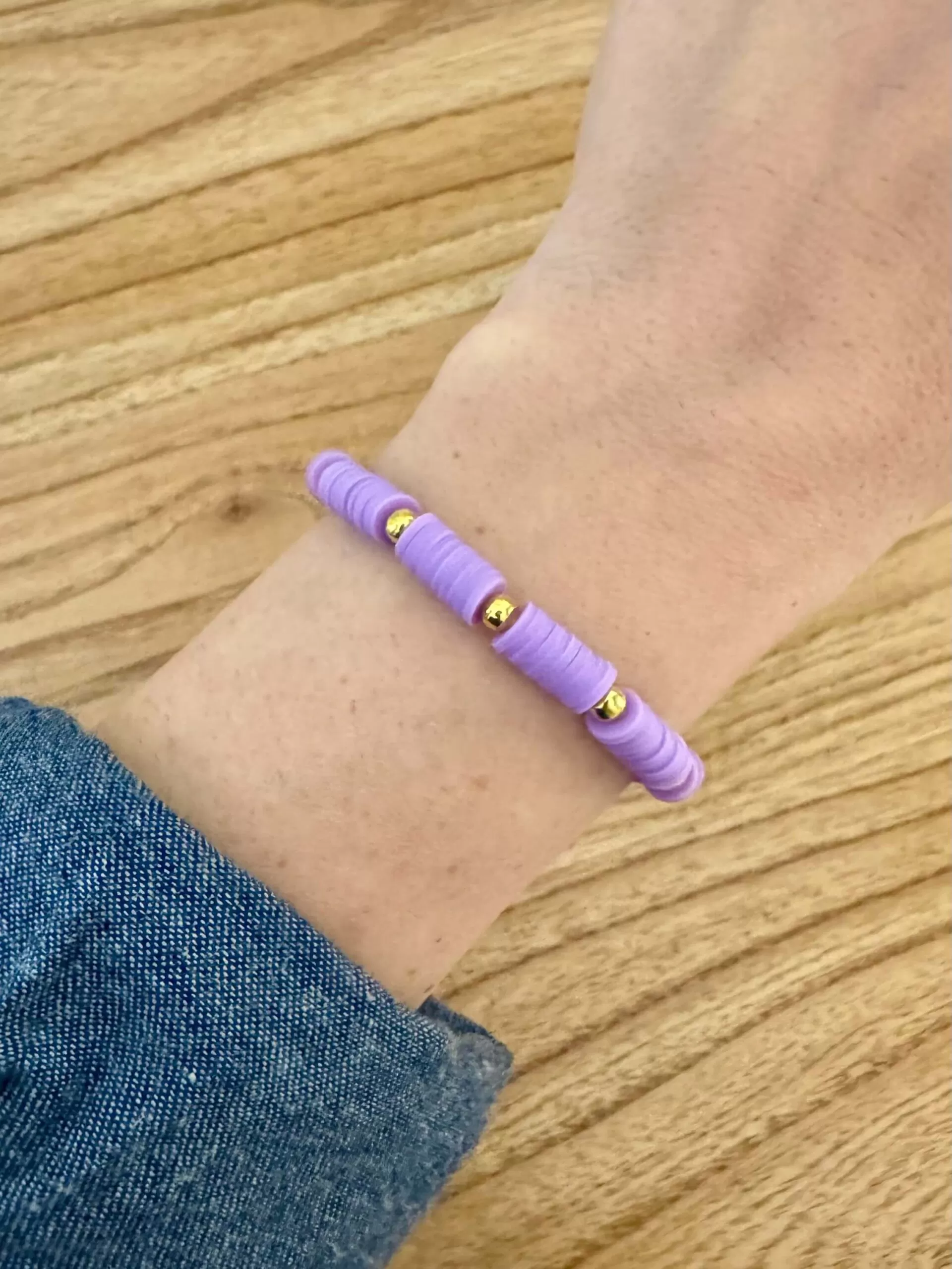 Pulsera elastizada con fimo lila y bolitas de metal doradas.