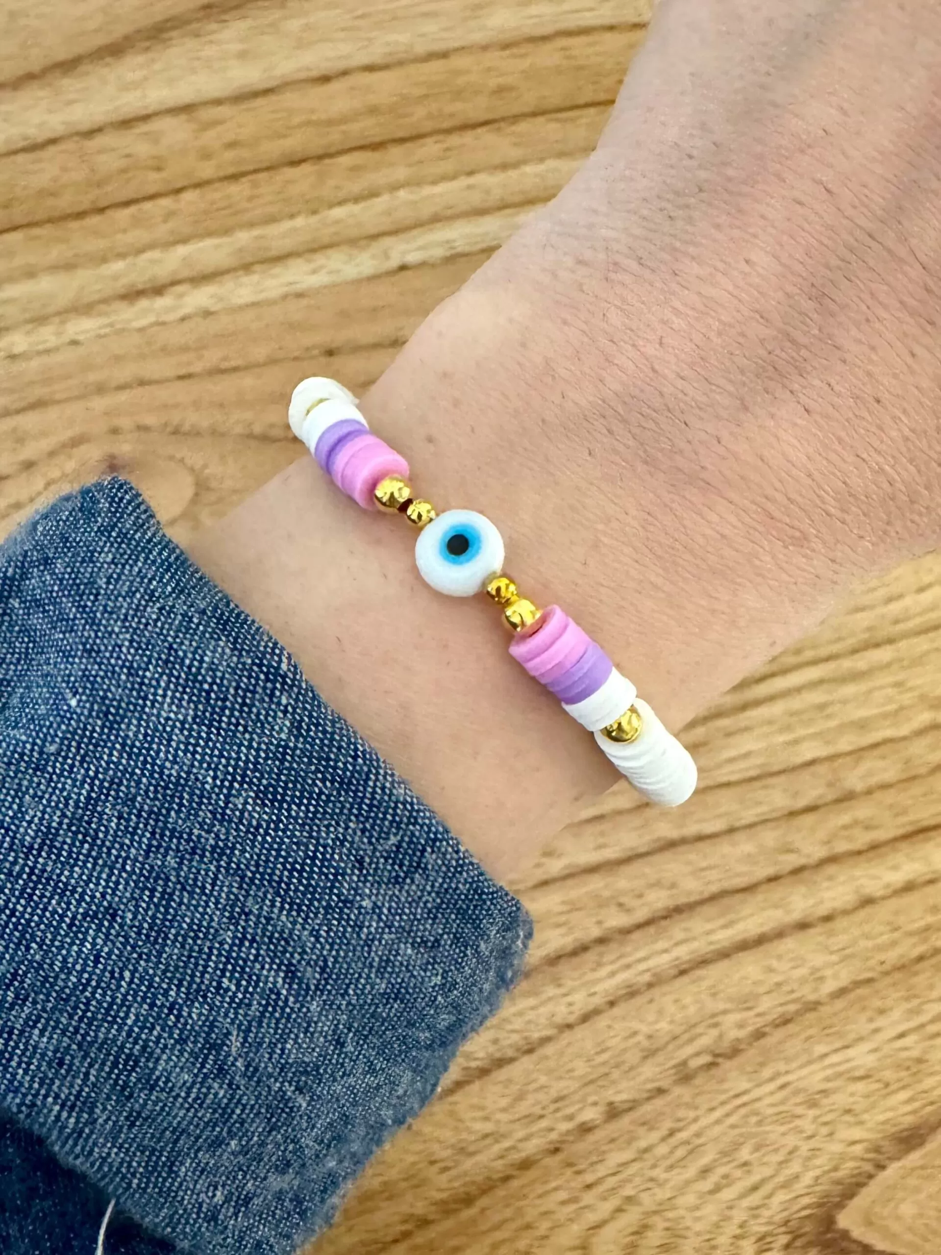Pulsera elastizada con ojito protector, fimo de colores pastel y bolitas de metal doradas.